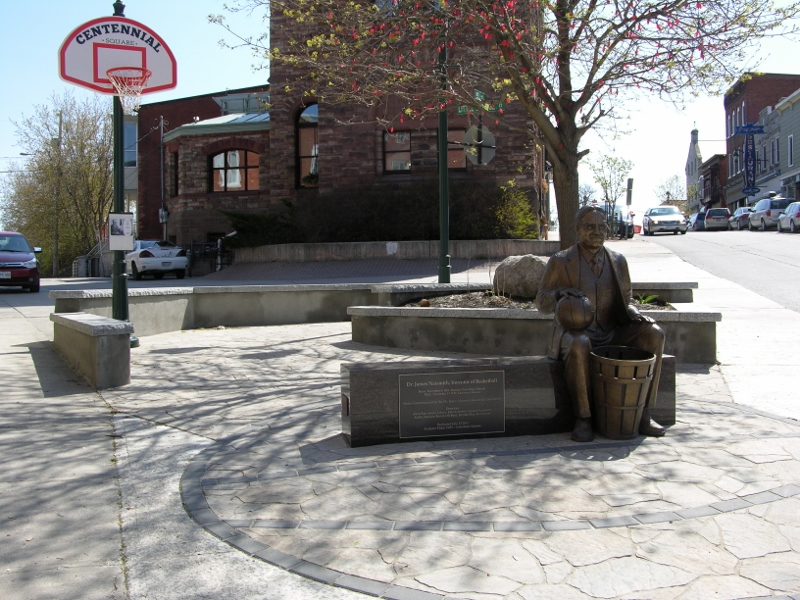 The formal installation took place on July 23, 2011 in Almonte, Ontario (now part of Mississippi Mills), the town where Naismith attended high school. The sculpture can be found in Centennial Square in the town’s historic centre and shopping district, where Mill Street and Little Bridge Street meet.